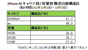 ここからは10月第2週のデータをもとに、「iPhone 4S」に限ったランキングとキャリア別・容量別のシェア、「iPhone 4」との売れ行きの比較などをみていこう。なお、あくまで「量販店の実売データ」である「BCNランキング」にもとづくもので、アップル直営店やキャリアのショップなど、すべての販売店を網羅した数値ではない点はあらかじめお断りしておく。