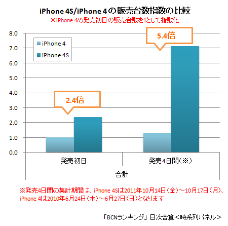 量販店の実売データを集計した「BCNランキング」によると、「iPhone 4S」発売日の10月14日を含む10月第2週(2011年10月10日~16日)の携帯電話全体の販売台数1位は、「iPhone 4S」SoftBank版の64GB、2位は「iPhone 4S」au版の32GBだった。3位~6位もすべて「iPhone 4S」で、前週1位だった「GALAXY S II SC-02C」は7位に、2位だった「Xperia acro SO-02C」は8位にダウンした。