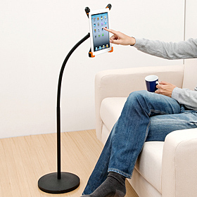 長さ950mmのフレキシブルアームを採用し、iPadを自由な位置に固定できる床置きスタンド。フロアスタンドのように台座部を床に直置きして、立った状態や座った状態、寝転んだ状態などでiPadを快適に使用することができる。