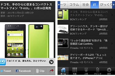 便利な機能として、気になる記事をオフライン環境で読むことができる「クリップ」機能を搭載。また、あらかじめ、Twitter、Facebook、mixiのアカウントを登録しておけば、簡単にニュース記事のURLとコメントを各サービスに投稿できる(一部ニュースを除く)。ニュースカテゴリの順番は自由に並び替えることができ、アプリの背景色は、黒、白の2色から切り替えられる。対応機種はOS4.0以上を搭載したiPhone、iPod touch(iPad互換)。