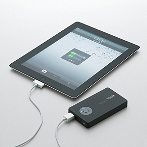 7.4V、2350mAhの充電式リチウムイオン電池を搭載したモバイルバッテリ。電源コンセントやPCのUSBポートに接続して充電する。iPad/iPad 2のフル充電時の40%まで充電できる。