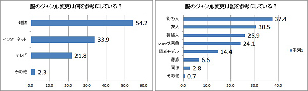 「服のジャンルを変えるときに参考にするメディア」の1位は雑誌(54.2%)、2位がインターネット(33.9%)、3位がテレビ(21.8%)だった。同様に「服のジャンルを変えるときに参考にする人」をたずねたところ、芸能人(25.9%)より、街の人(37.4%)、友人(30.5%)のほうが多く、身近な存在を参考にしている人が多いことがわかった。