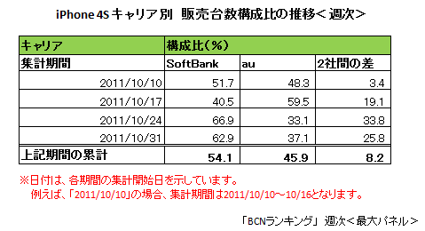 最後に、「iPhone 4S」のキャリア別シェアの最新の状況をお伝えしよう。発売第1週に当たる10月第2週(2011年10月10~16日)はソフトバンクモバイル51.7%、au48.3%で、ほぼ半々だった。一転、発売第2週の10月第3週(10月17~23日)はau59.5%、ソフトバンク40.5%でauが優勢になり、累計でもauが逆転した。しかし、発売第3週の10月第4週(10月24~30日)はソフトバンク66.9%、au33.1%、10月最終週(10月31日~11月6日)はソフトバンクが62.9%、auが37.1%と、ソフトバンクがauに20ポイント以上の差をつけ、大きく引き離している。