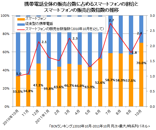 携帯電話全体の月間販売台数に占めるスマートフォンの割合(スマートフォン率)は、2011年6月に初めて5割を超えた後、7月~9月の3か月間は、50%台後半でとどまっていた。10月は、前月の57.1%から一気に12.9ポイント増加し、小数点第2位を四捨五入して70.0%という切りのいい数字になった。