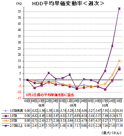 価格は下落が続いていたが、需給バランスが崩れたことで、10月半ばから急騰。8月1日の週を基点にした税抜き平均単価の値上がり率は、10月31日の週には1TBで108.7%、2TBで115.3%、2.5TB以上で157.6%となった。