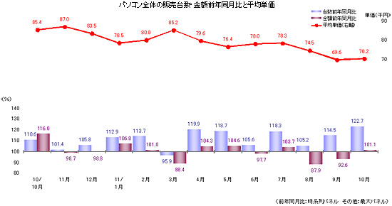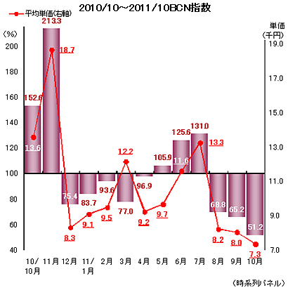 BCNランキングで収集しているデジタル家電、パソコン関連など、116品目の実売データから、全商品の平均販売単価と販売金額の前年同月比をまとめた「BCN指数」は、10月は金額で前年同月比51.2で、昨年のテレビ特需による反動が顕著だった。