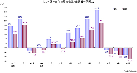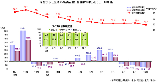 地デジ化需要で成長してきた薄型テレビは、8月以降前年を大幅に下回り、10月は台数ベースで前年比28.4%となった。11月は、昨年のエコポイント駆け込み特需で過去最高の台数を記録した反動で、前年比80~90%減を予想している。