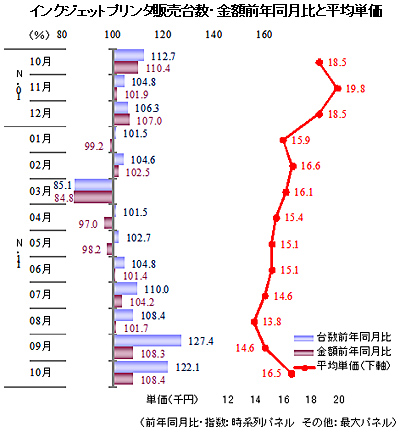 インクジェットプリンタは、無線LAN対応モデルがスマートフォンやタブレット端末ユーザーの需要を喚起し、台数ベースで9月は127.4%、10月は122.1%と好調に推移した。しかし、台数シェア4割前後を占めるキヤノンのタイ工場が大きな被害を受けたことから、需要のピークである年末商戦で品薄によるダメージが予想され、年末商戦は前年比20%減とした。