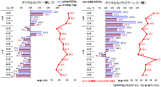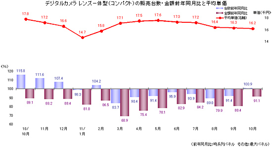 デジタルカメラは、レンズ一体型(コンパクトタイプ)が、10月に台数ベースで8か月ぶりに前年並みに回復。税抜き平均単価は1万6000円強で下げ止まった。道越エグゼクティブアナリストは、「一部の高級モデルが売れる傾向が出てきているなど、価格の下落幅が狭くなってきていることは間違いない」としながらも、今後の成長に向けて「活路を見出していくことが必要」と訴えた。