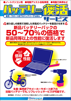 「バッテリー復活サービス」は、繰り返し使用して劣化してしまった充電式バッテリを、新品の50~70%の価格で交換することによって、同等もしくはそれ以上の性能に復活させるサービス。