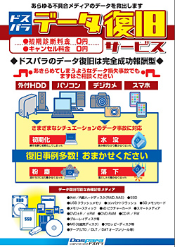 データ復旧が可能な記憶メディアは、HDD(RAID/NAS)、SSD、USBフラッシュメモリ、コンパクトフラッシュ、SDメモリカード、メモリースティック、xDピクチャーカード、スマートメディア、DVD±R/±RW、DVD-RAM、CD-R/RW、ブルーレイディスク、MO、フロッピーディスク、各種テープなど。初期診断料金とキャンセル料は無料で、価格は完全成功報酬型。