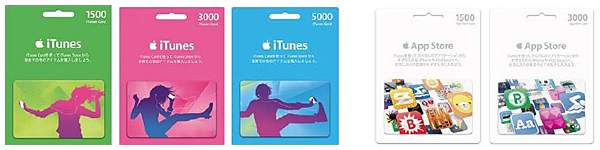 「iTunes Store」での買い物に使用できる「iTunes Card」は、1500円、3000円、5000円の3種類、「App Store Card」は1500円、3000円の2種類を取り扱う。