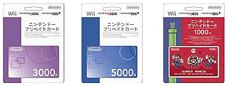 「ニンテンドーDSiショップ」や「Wiiショッピングチャンネル」で使用可能な「ニンテンドープリペイドカード」は、レギュラーカードが3000円と5000円の2種類、デザインカードが1000円の1種類。