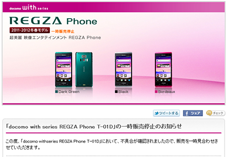 ドコモ、スマートフォン「REGZA Phone T-01D」の販売を一時停止
