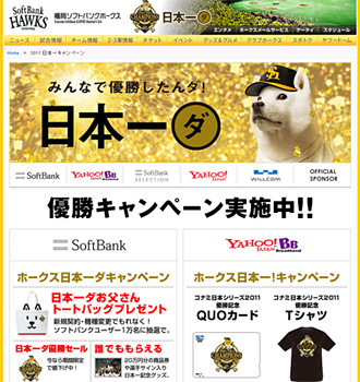ソフトバンクグループのソフトバンクモバイル、ソフトバンクBBと、「Yahoo! JAPAN」を運営するヤフーは、プロ野球・福岡ソフトバンクホークスが日本シリーズで優勝し、日本一に輝いたことを記念して、「日本一“ダ”キャンペーン」を、11月21日から開始する。