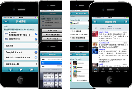 「あぐらいふ」は、Agoopが提供するスマートフォン向けの周辺スポット情報検索サービス。お出かけ先で、ちょっと寄ってみたいお店を検索したり、そのお店の評判を確認したり、自分の感想をTwitterにつぶやいたりといった使い方で、ユーザーの日常生活を応援する。