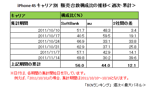 「iPhone 4S」に限ったキャリア別シェアは、ソフトバンクモバイル53.0%、au47.0%。携帯電話全体ではなく、iPhone 4Sの総販売台数を母数にすると、一見、ソフトバンクが優勢のようにみえるが、販売台数の差はそれほど大きくなく、発売一月目は、ほぼ半々とみなしていいだろう。11月20日までの累計では、ソフトバンクモバイル56.0%に対し、auは44.0%と、10月末の時点より、差が広がっている。