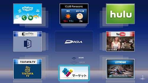 「ディーガ」向けに提供する対応アプリは、無料のクラブパナソニック、Skype、Twitter、Picasaウェブアルバム、YouTube、Facebook、おうちごはん、Ustream、radiko.jp、各種ゲームと、有料のTSUTAYA TV、MLB.TV、Hulu、有料/無料のアクトビラ。