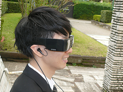 一方、「MOVERIO」を装着している人を周囲の人が見ても、映像を見ていることはわからない。外部からはハーフミラーを透過して、装着者の目が見えるだけ。特に付属のシェードを外したときには、ただの透明なグラスにしか見えないので、とても映像を視聴しているようには見えない。