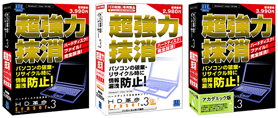 HD革命/Eraser Ver.3(左から「通常パッケージ」「CD起動専用パッケージ」「通常パッケージアカデミック版」)