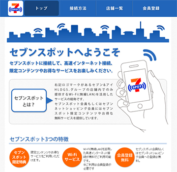 「セブンスポット」は、セブン&アイグループの各店舗で展開する公衆無線LANサービス。対応スポットでは、1回につき最大60分間、1日につき3回まで、スマートフォンやノートPCなど、手持ちのWi-Fi(無線LAN)対応機器をWi-Fi経由でインターネットに接続できる。利用は無料だが、「セブンスポット」の会員登録が必要。セブン&アイのネット通販サービス「セブンネットショッピング」会員IDでも利用できる。