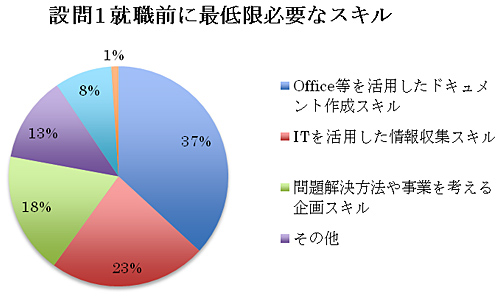 キャンペーンにあたって、WDLCが会員企業の人事採用担当者を対象に行ったアンケート調査によると、「新社会人が就職前に最低限必要なスキル」として最も多かった回答が「Officeなどを活用したドキュメント作成スキル」だった。続いて「ITを活用した情報収集スキル」「問題可決方法や事業を考える企画スキル」の順だった。回答数は50社。