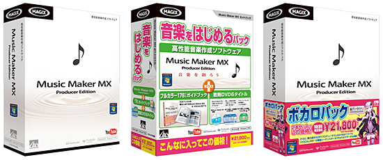 左から「Music Maker MX Producer Edition」「Music Maker MX 音楽をはじめるパック」「Music Maker MX ボカロパック 結月ゆかり」