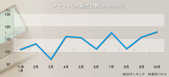 BCNランキングによれば、今年に入ってから、ほとんどの月でノートPCの販売台数が前年同月を上回っている。1月と2月が1ケタ成長で、3月は東日本大震災の影響で下回ったが、4月・5月には再び2ケタ成長に戻った。以後、6~9月は1ケタと2ケタの間を行き来し、10月は今年最高の成長率となる15.5%増を記録した。1月と2月に関しては、インテルの第二世代Core iプロセッサーの不具合で出荷停止になるというハプニングがあったが、そのマイナス要因よりも買い替え需要のほうが勝ったことになる。4月以降は、東日本大震災の影響でいったん落ち込んだ東北地方を中心とする購入者の復活が大きな要因の一つになった。