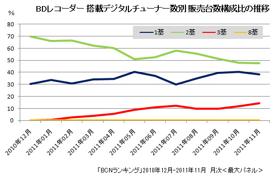 この冬、特に注目したいのが、3波対応デジタルチューナーを2基以上搭載した同時録画対応のBDレコーダーだ。夏までは、チューナー2基でダブル録画ができるモデルが主流だったが、秋になって、パナソニックとソニーからトリプルチューナーモデルが登場。2011年11月のBCNランキングでは、トリプルチューナーモデルのシェアが14.2%になった。
