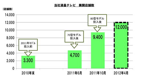 シャープは、2011年初頭から大型液晶テレビを強化。4月には70V型を、9月に80V型を投入し、60V型以上の液晶テレビのラインアップ数は、2010年の4モデルから2011年には18モデルまで拡大した。また、米国での製品取り扱い店舗を、昨年末の3300店から今年10月には9400店にまで増やしている。