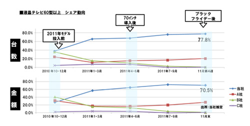 ラインアップの拡充と、販路の拡大などによって、11月末時点で、米国での60V型以上の液晶テレビ市場でのシェアは、販売台数で77.8%、金額で70.5%に達し、韓国勢を抑えてトップに立った。