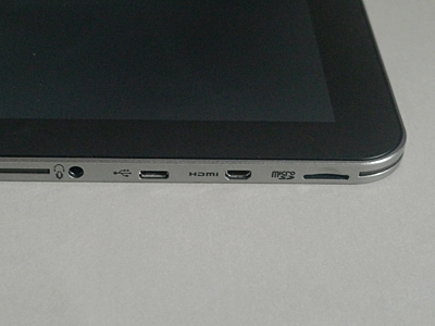 世界最薄の約7.7mmながら、「REGZA Tablet AT700」はタブレット端末として十分なインターフェースを搭載している。microUSB端子やmicroHDMI端子は、本体のスリットデザインに合わせて配置しているため、違和感はない。ステレオスピーカーも、本体背面のスリットに沿って配置している。