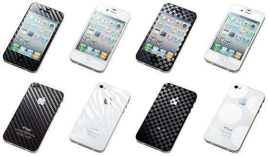 デザイン印刷を施した表面用の液晶保護フィルム、背面用フィルム、クリーニングクロスのセット。立体的で透明なデザインの「カーボンパターン」「ゼブラ」「ブロックチェック」「コインドット」の4種類がある。「カーボンパターン」「ゼブラ」は12月16日に、「ブロックチェック」「コインドット」は2012年1月以降に発売する予定。