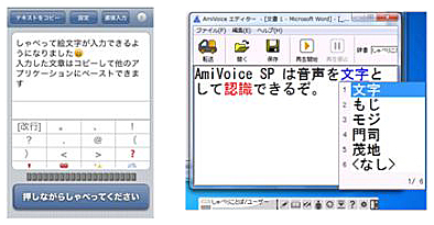 「音声認識メール クラウド」(左)と「AmiVoice SP」の画面