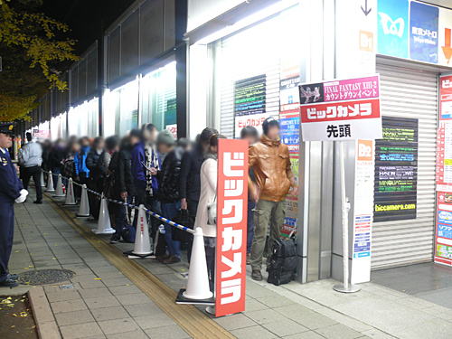 朝6時30分という早朝に始まったカウントダウンイベントだが、すでに多くの来店者で行列ができていた。イベントでは、昨日の昼から並んでいたという先頭のお客様を讃えて、大島優子さんが『FF XIII-2』を渡すセレモニーを行った。