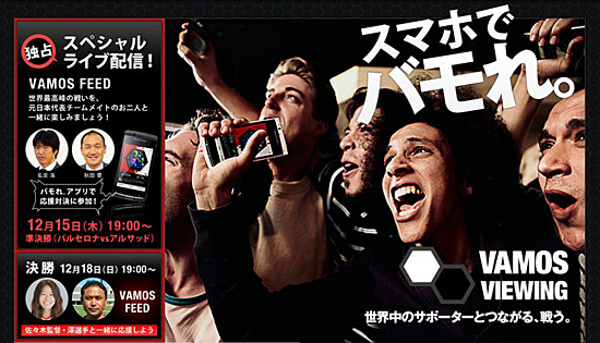 12月8~18日の日程で開催している「FIFA クラブワールドカップ ジャパン 2011」に合わせて、ネットワーク対応モバイル機器やSNSなどを活用し、双方向でで臨場感あるサッカー観戦が楽しめる「バモれ。アプリ」を配信するとともに、「VAMOS VIEWING」特設ポータルサイトをオープンした。