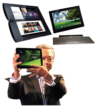 左上から、ソニー「Sony Tablet Pシリーズ」、ASUS「Eee Pad Transformer TF101」、「レグザ タブレット」を手にする大角正明・東芝デジタルプロダクツ&サービス社社長