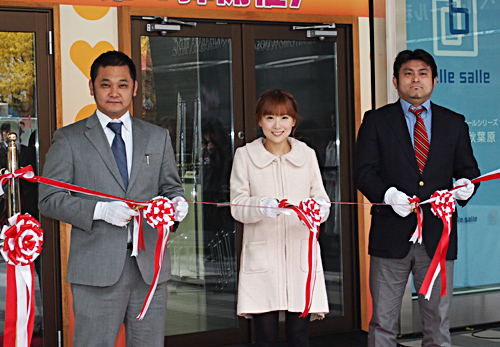 オープニングセレモニーでは、サードウェーブの尾崎健介社長(左)と重盛さと美さん(中央)、日本オンラインゲーム協会理事企業、NHN JAPANの山口剛志氏によるテープカットが行われた