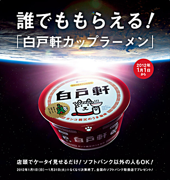ソフトバンクモバイルは、2012年1月1日から31日まで、ソフトバンク携帯電話取扱店に来店して携帯電話・PHSを見せた人に、CMでおなじみの「白戸家のお父さん」のイラストをパッケージにプリントしたカップラーメン(ガンコ親父のうま塩味)」を、もれなくプレゼントする。