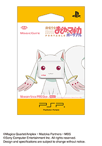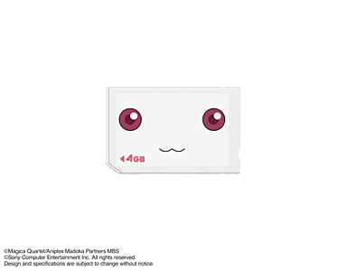 『魔法少女まどか☆マギカ』の物語の鍵を握るキャラクター“キュゥべえ”をモチーフにした特別仕様の白いメモリースティック。カード本体に特徴的な「目」と「口」を描き、実用性を持たせるため、挿入方向を示す矢印と容量を記した。特典として、“キュゥべえ”をモチーフにしたPSP向けのオリジナルカスタムテーマを「PlayStation Store」からダウンロードできるプロダクトコードが付属する。