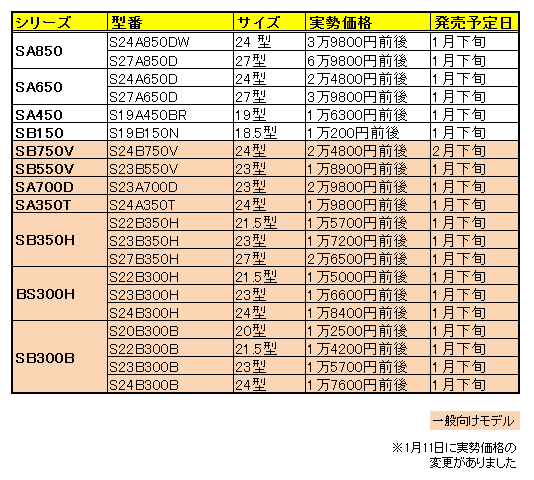 「SB300Hシリーズ」は、ミニD-sub 15ピンとHDMI入力端子2系統を備えるエントリーモデル。HDMI-DVIの変換ケーブルが付属し、DVI接続にも対応する。ラインアップは21.5型、23型、24型の3機種。「SB300Bシリーズ」は、ミニD-sub 15ピンとDVI-D入力端子の2系統を備える。ラインアップは20型、21.5型、23型、24型の4機種。