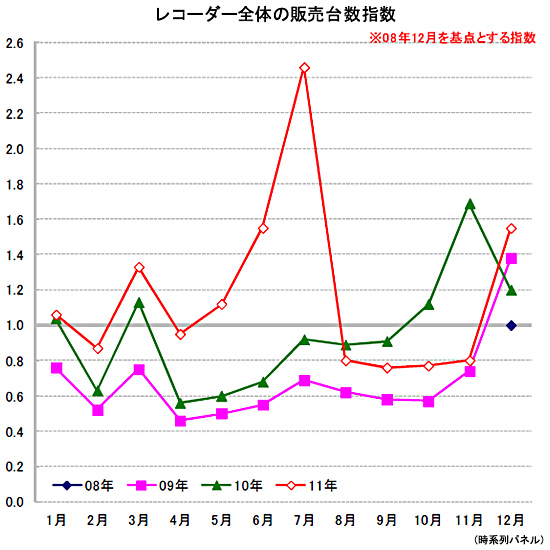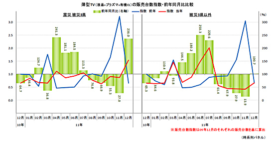 被災3県の液晶テレビ、プラズマテレビ、有機ELを合わせた薄型テレビは、台数ベースで前年を下回り、11月は前年同月比27.0%までに落ち込んだ。ところが12月に反転して236.0%まで急上昇。テレビに連動してレコーダーも伸び、12月は225.5%に達した。地デジ特需が売上げを押し上げていることがわかる。