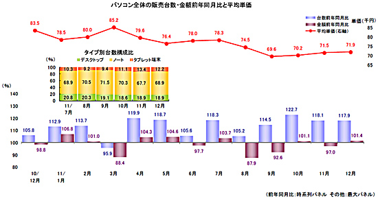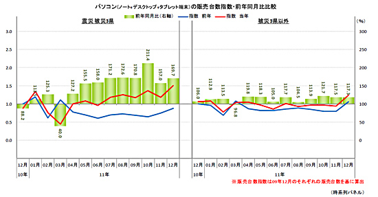 今年、最も期待が高いのがPCだ。HDDを搭載しているPCだが、タイの洪水の影響は少なく、デスクトップ/ノート/タブレット端末を合わせた台数ベースは、11月が前年同月比118.1%、12月が117.9%と2ケタ増で伸長している。