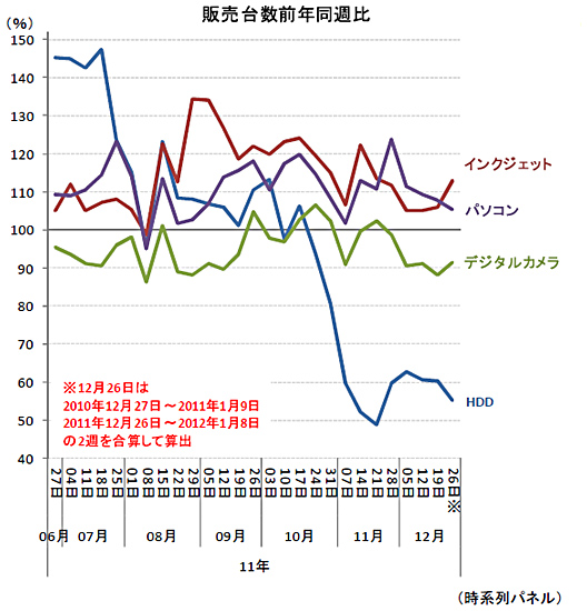 製品別の台数ベースのグラフからは、HDDの受けたダメージが最も大きかったことがわかる。2011年11月21日-28日の週は、前年同週比50%を切っており、12月は60%前後と低い位置で推移した。