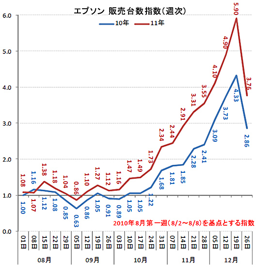 キヤノンは、タイのインクジェットプリンタの主力工場が浸水被害を受けた。インクジェットプリンタのメーカー別販売台数シェアでは、洪水が激しくなった時点からキヤノンが失速し、昨年1月は48.1%あったシェアを12月には29.1%までに落とした。しかし、代わりにエプソンが市場を支え、全体では前年を割ることなく推移した。