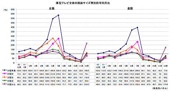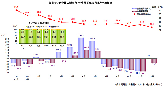 製品別では、地デジ特需のおかげで2010年から2011年にかけて爆発的に伸びた薄型テレビとレコーダーが、昨年8月以降は前年割れの状況。そのまま年末商戦に突入したが、12月は台数ベースで前年同月比103.1%とわずかに好転した。しかし、価格の下落が著しく、金額ベースは70.7%と大きく下回った。