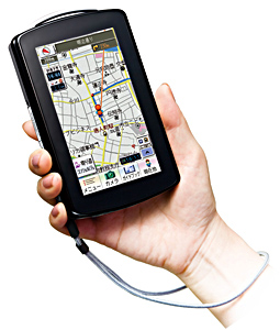 位置情報を測位するGPSと、向いている方向がわかる電子コンパス(歩行モード時)を搭載し、地図情報で位置と方角を示す街歩きサポート用ナビ。有効約200万画素のカメラを搭載する。