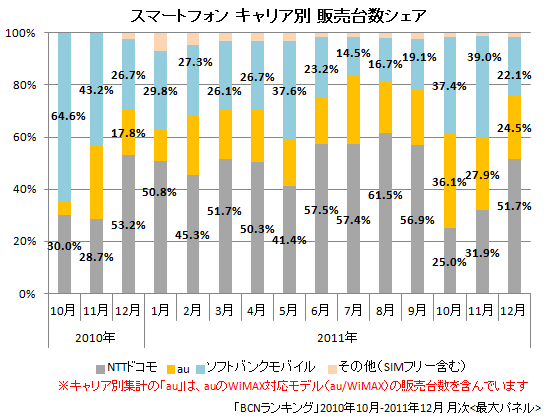 スマートフォンの販売比率が8割近くまで上昇した要因は、ドコモとauのスマートフォンの販売台数が、前月に比べて大幅に増加したことにある。従来型携帯電話(フィーチャーフォン)の販売台数は前月比115.8%の微増にとどまったが、スマートフォンは187.1%と大幅に伸び、特にドコモは302.6%と、直前の11月の3倍に膨らんだ。その結果、スマートフォンに限った2011年12月のキャリア別販売台数シェアは、ドコモがほぼ過半数の51.7%を占め、9月以来、久しぶりにトップに立った。どうやら既存のドコモユーザーが、新製品待ちの買い控えから一転、購入に動いたようだ。
