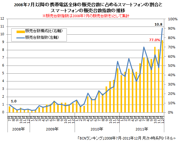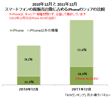 iPhoneを含むスマートフォンの販売台数は、従来型の携帯電話がまだ全体の7割弱を占めていた2010年10月の3.5倍、日本での初代iPhoneである「iPhone 3G」が発売された2008年7月の10.8倍に拡大。集計開始以来、最大を記録した。