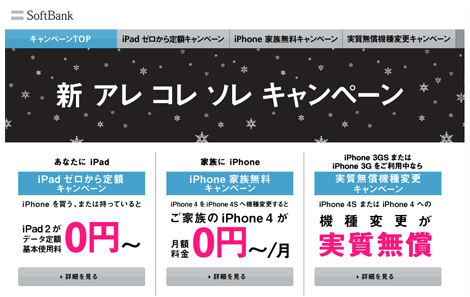 「iPadゼロから定額キャンペーン」は、ソフトバンクモバイルのiPhoneユーザーが、2回線目としてiPad 2 Wi-Fi + 3Gモデルを新規に購入すると、100MBまで無料の2段階型の定額料金プラン「(iPad 専用)ゼロから定額」に加入でき、基本使用料0円から利用できるというもの。新規購入だけではなく、すでにiPhoneを持っているユーザーも対象となる。注意事項、料金例などの詳細は、「新 アレ コレ ソレ キャンペーン」からアクセスできる各キャンペーンページに記載している。